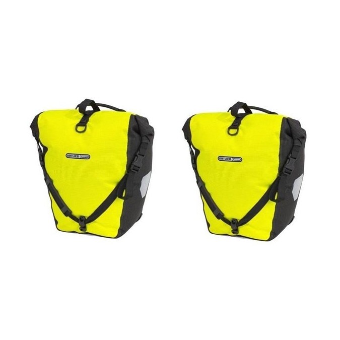 Sacoches arrière haute visibilité. Référence fabricant Ortlieb : F5151. La haute visibilité est très importante pour nous chez ORTLIEB car c'est une question de sécurité. Le tissu Cordura enduit de polyuréthane imperméable en jaune fluo et les parties en tissu noir de ce sac sont densément tissés avec un fil réfléchissant à haute lumière. Cette composition transforme l'ensemble du sac en un réflecteur éminemment visible lorsqu'il est capté par les phares des voitures qui passent.