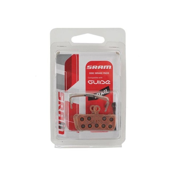 The SRAM Guide/Trail metal brake pads are sintered and feature a steel backing plate. They are compatible with SRAM Guide, G2, and Avid Trail disc brakes. The manufacturer's part number is 00.5318.003.005.